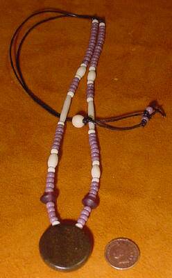 This small amulet is carved from Ebony SPS. Strung on black leather cord, it features bone and glass beads, with a bead in back for length adjustment.